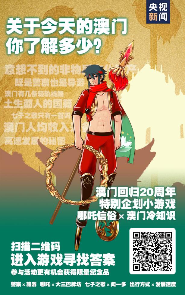 还想再看看小编手绘的帅气哪吒吗?还想多了解一下澳门的冷知识吗? 来,让我们一起来玩一个“找不同”的小游戏,找到不同,集齐装备,你不但能了解关于澳门的冷知识,还可以通过完成游戏,有机会获得中央广播电视总台新闻新媒体中心联合中国邮政推出的“澳门哪吒信俗”限量版纪念明信片。 只要长按文章下方海报读取二维码,或者点击这里就可以进入游戏了!