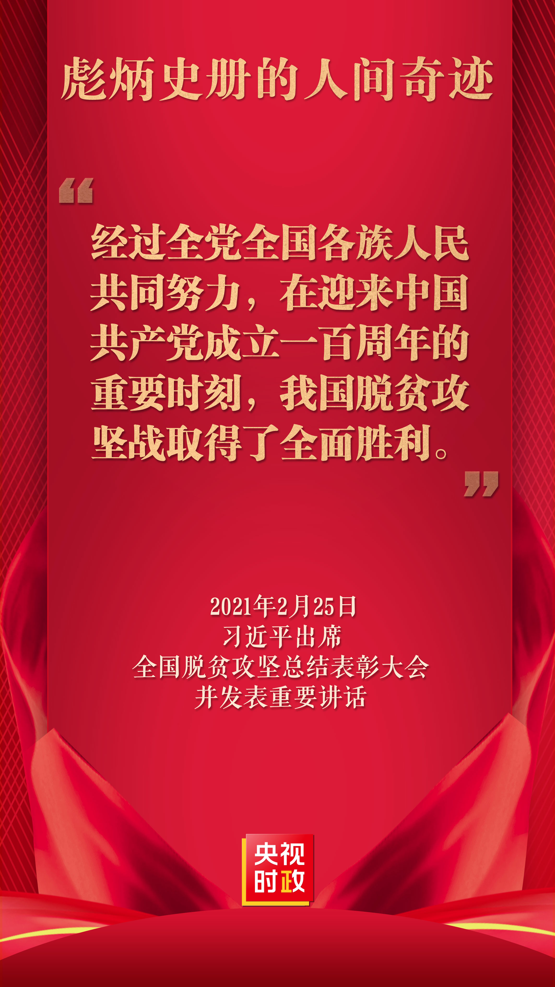 习近平庄严宣告,经过全党全国各族人民共同努力,在迎来中国共产党成立一百周年的重要时刻,我国脱贫攻坚战取得了全面胜利,现行标准下9899万农村贫困人口全部脱贫,832个贫困县全部摘帽,12.8万个贫困村全部出列,区域性整体贫困得到解决,完成了消除绝对贫困的艰巨任务,创造了又一个彪炳史册的人间奇迹!这是中国人民的伟大光荣,是中国共产党的伟大光荣,是中华民族的伟大光荣!
