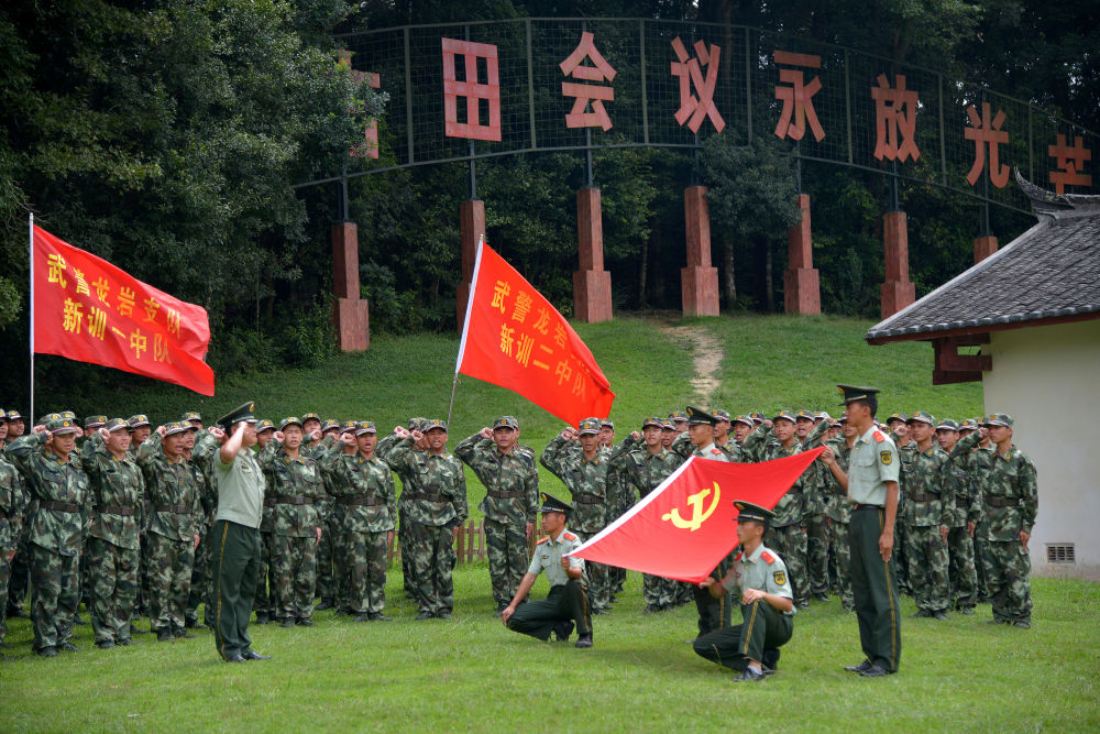 武警福建总队龙岩支队组织新兵在古田会议会址前宣誓(2014年9月19日摄)。新华社发(苗继芳 摄)