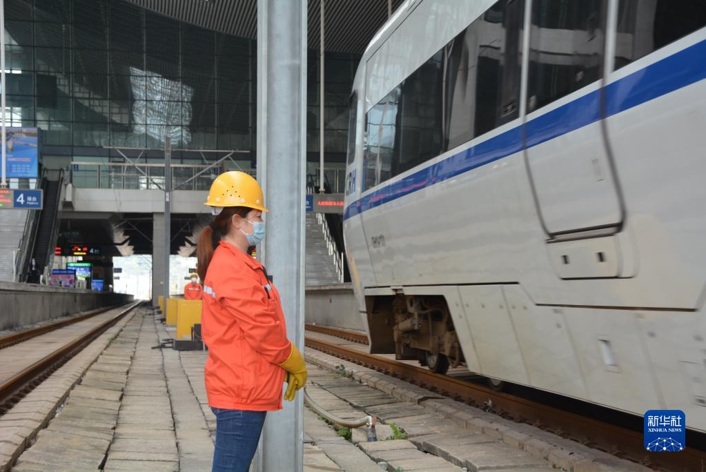 1月9日,完成注水操作后,汪美端目送列车驶离。新华社记者 颜之宏 摄