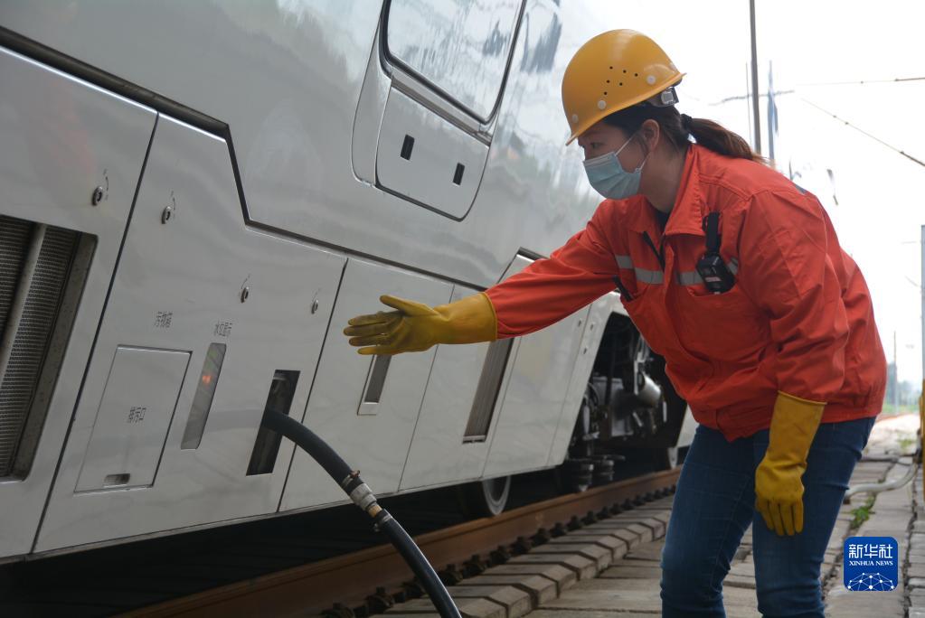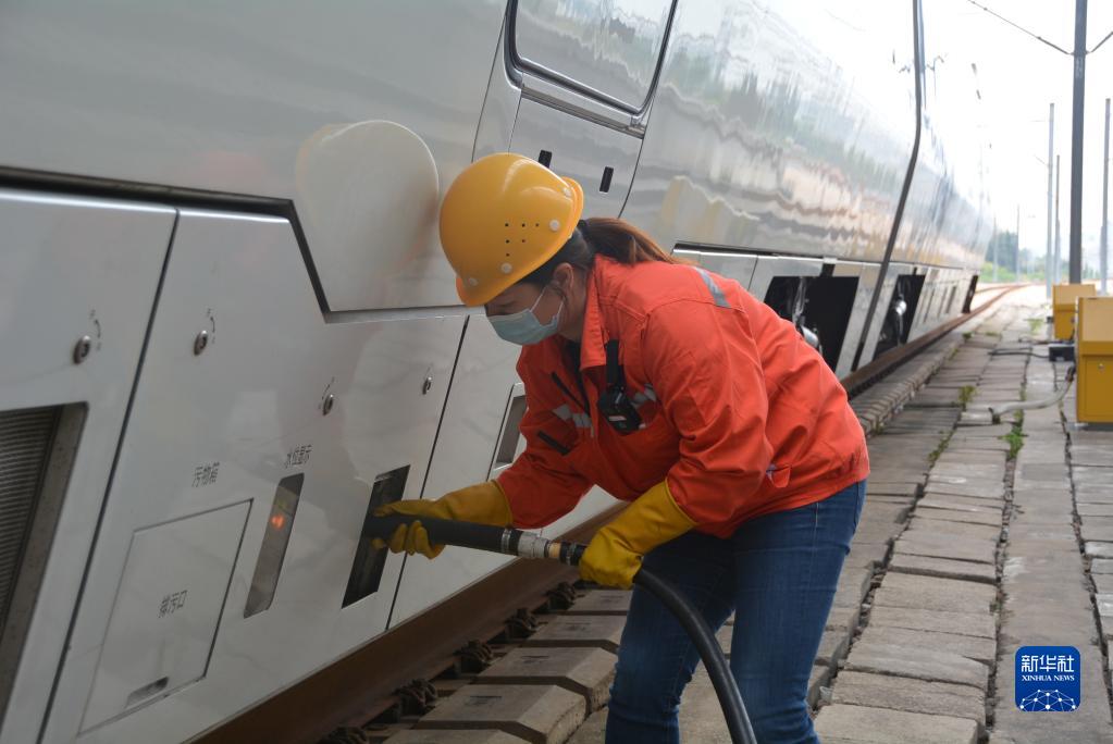 “G2380加水完毕,水管脱离!”在完成8节车厢的注水任务后,汪美端和同事还要再仔细确认水管是否均已脱离列车。在一阵鸣笛声后,列车缓缓出站。