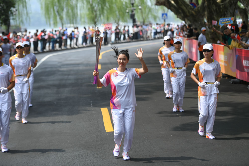 2023年9月8日,杭州亚运会火炬传递在杭州西湖涌金公园广场启动。火炬手王沁鸥在火炬传递中。新华社记者 黄宗治摄