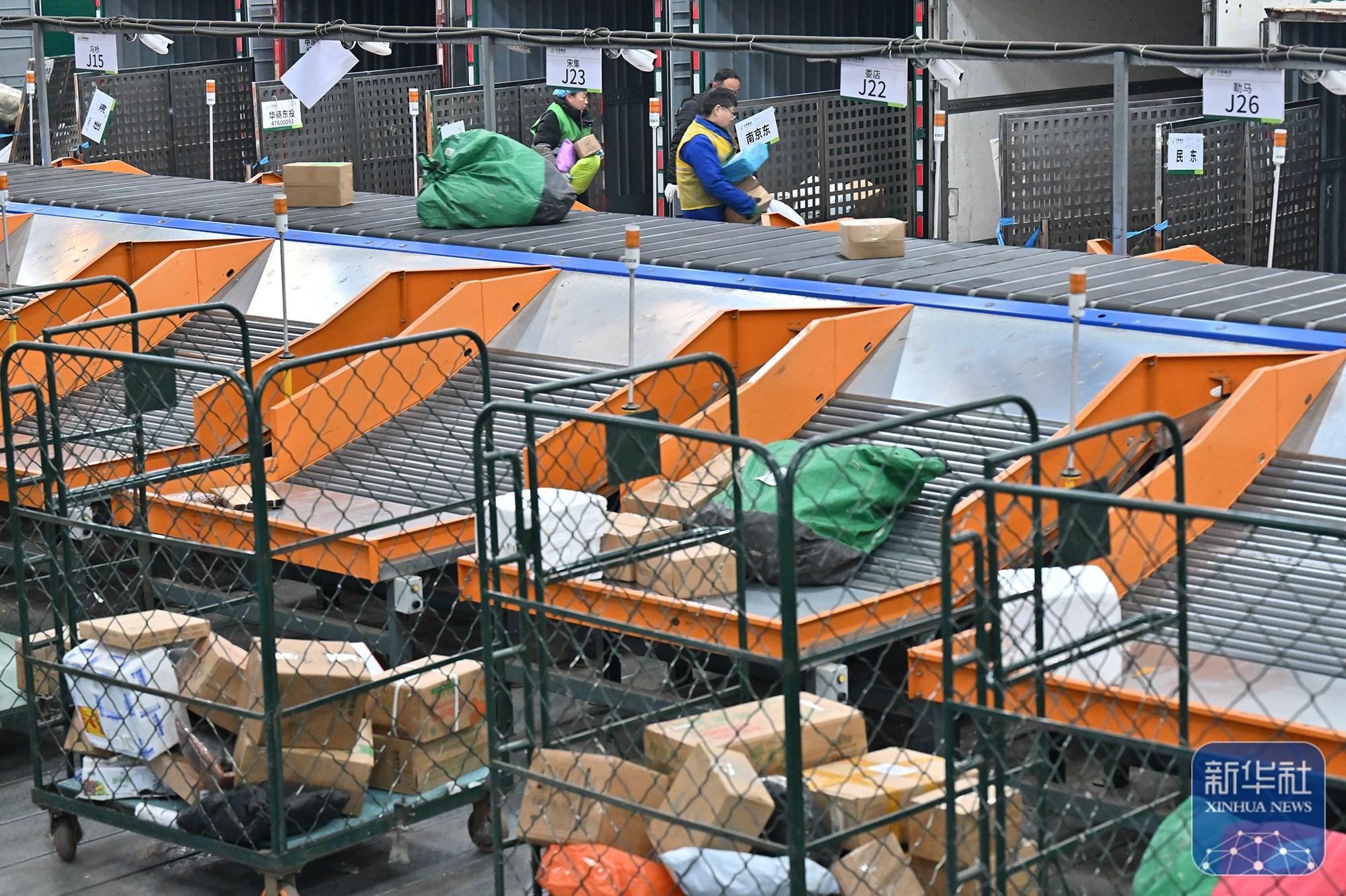 ↑ 1月2日,工作人员在中国邮政集团有限公司商丘市分公司邮件处理中心搬运快递。新华社发(李恒摄)