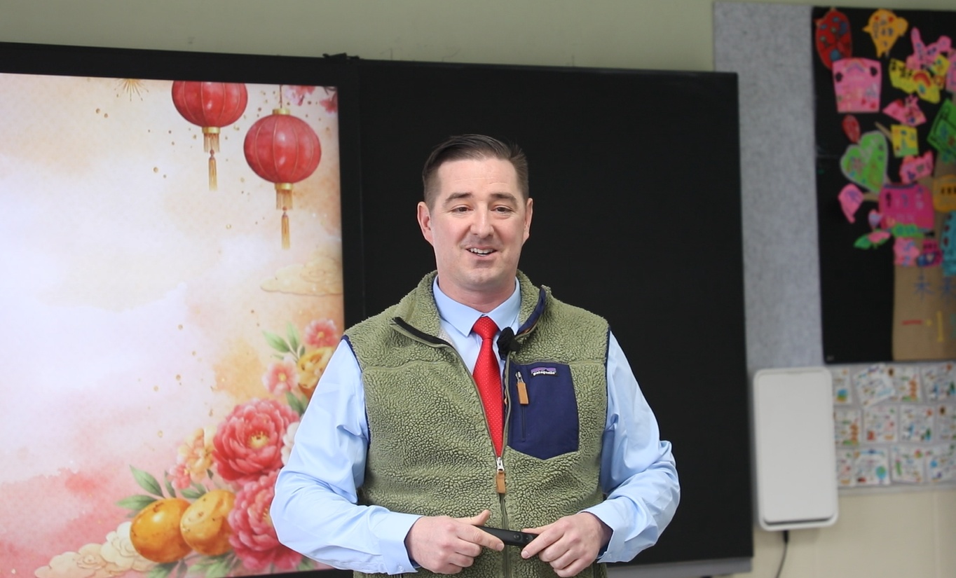 清晨的阳光,透过山东淄博高新区外国语学校一年级教室的窗户,洒在一群稚嫩的脸庞上。阿德里安正站在讲台上,面带微笑,为孩子们教授英语课。