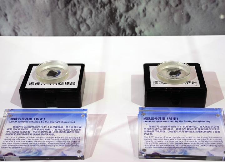 2025年11月5日在第八届进博会国家展中国馆拍摄的“嫦娥五号”月壤和“嫦娥六号”月壤。新华社记者 刘颖 摄