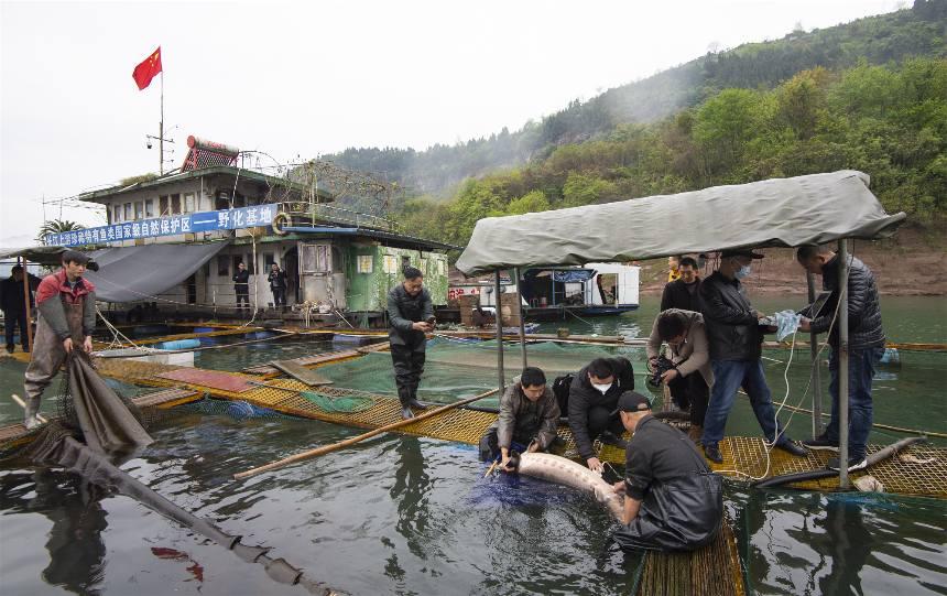 临近中午,重庆市万州区水产研究所科研组组长王飞身着水裤,兜起渔网向监测点挪动,水浅处现出数条大鱼,黑背硬脊,翻搅水花,同事们相互配合,抬起其中一条,电子镜头刚扫过,信息立刻显现:长江鲟、雌性、21公斤……