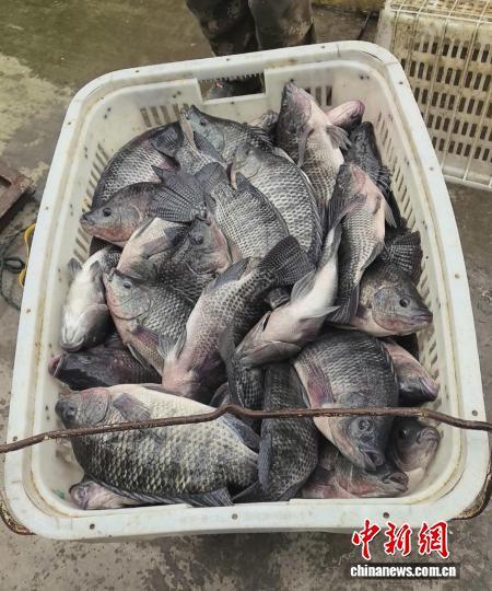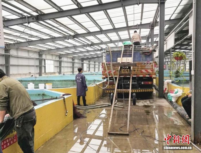 工人将捕捞上来的活鱼转运上车。杨景丽 摄