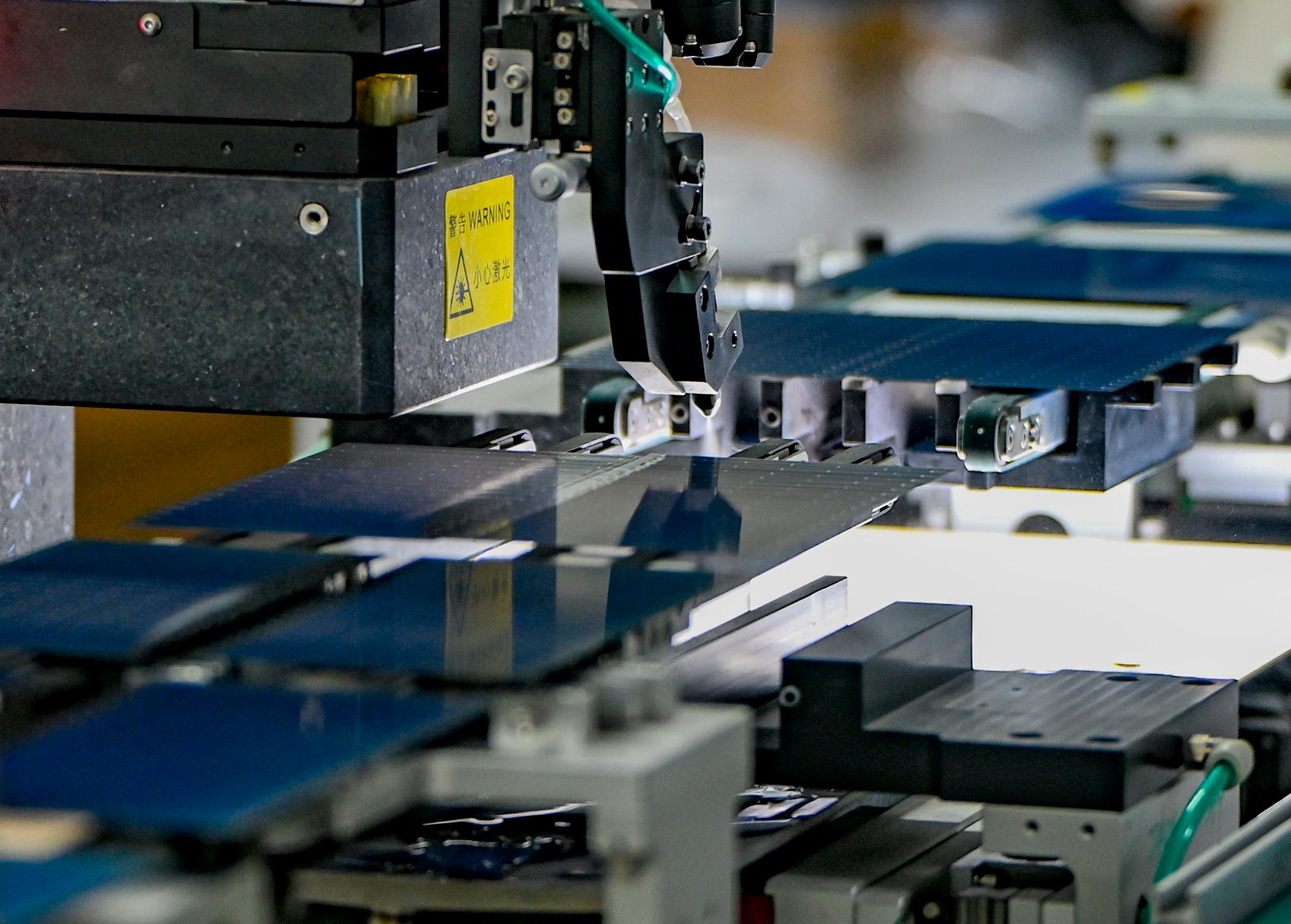 在新疆巴音郭楞蒙古自治州若羌县一家新能源有限公司,全自动划片机在切割光伏电池片(2025年9月22日摄)。“十四五”期间,电动汽车、光伏产品、锂电池等“新三样”产品2025年出口规模接近1.3万亿元,比2020年增长3.5倍。