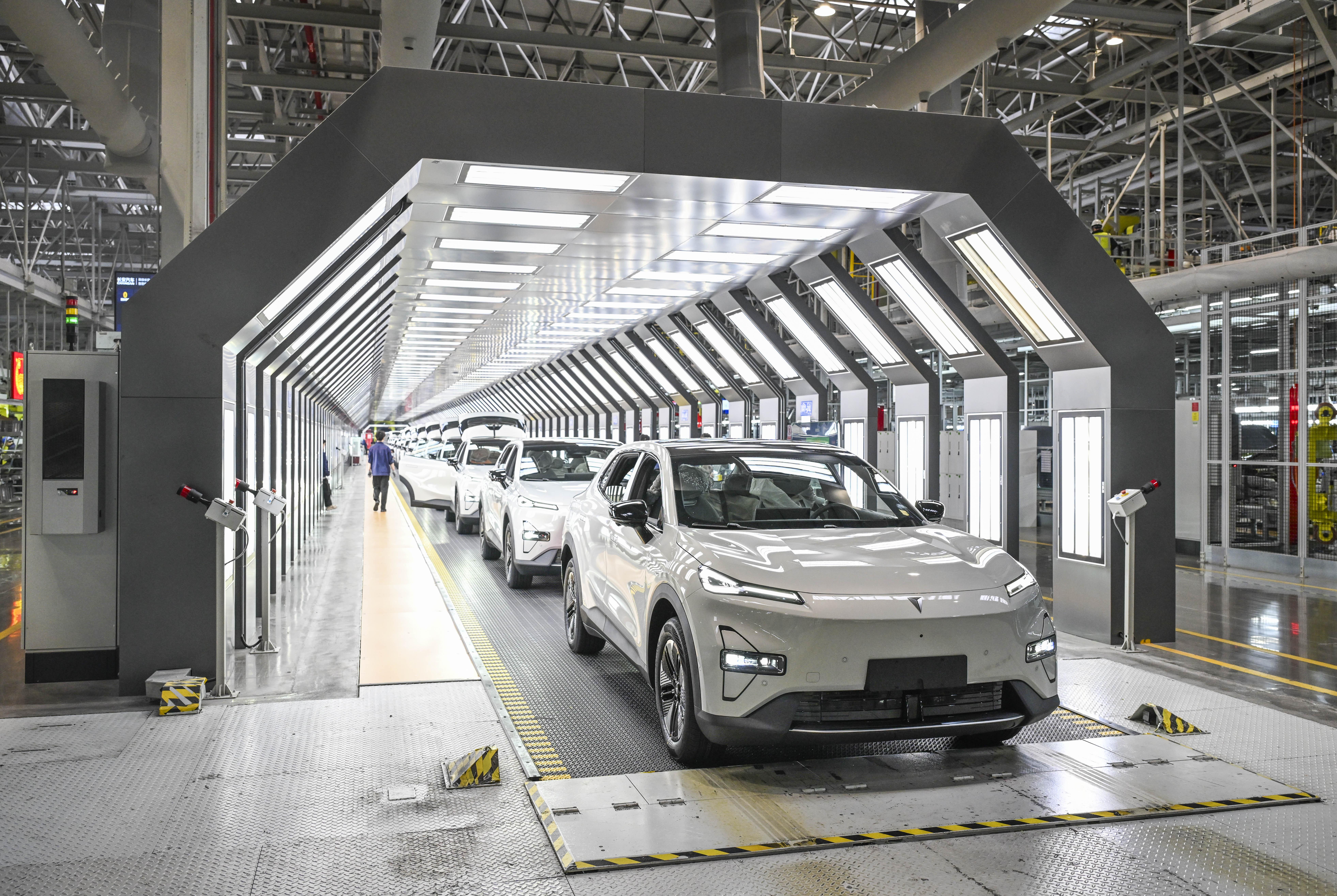 在位于重庆市渝北区的长安汽车数智工厂总装车间拍摄的即将下线的新能源汽车(2025年1月9日摄)。2025年底,全国新能源汽车保有量达4397万辆,比“十三五”末的492万辆增长近8倍。
