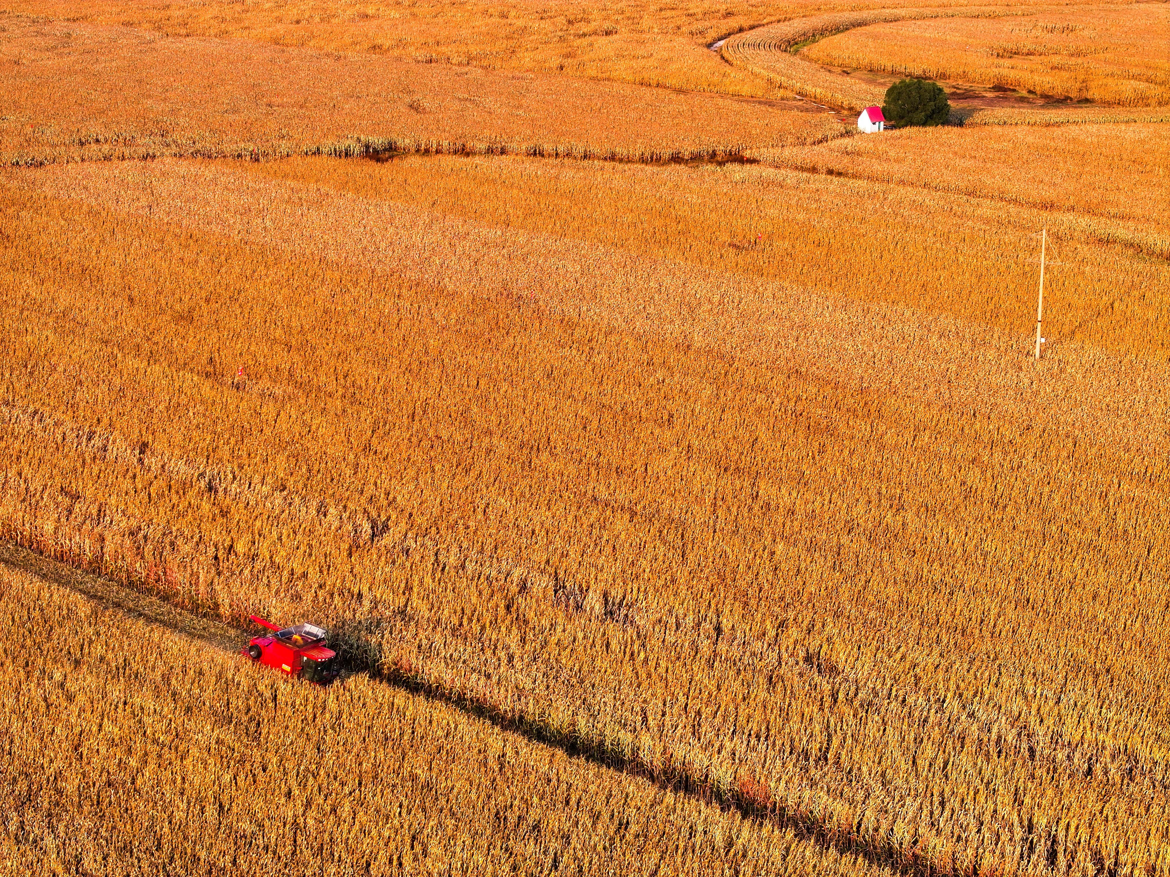 农机手驾驶收割机在内蒙古自治区通辽市科尔沁区丰田镇收割玉米(2025年10月14日摄,无人机照片)。“十四五”时期,粮食总产量由2021年的1.37万亿斤增至2025年的1.43万亿斤,连续两年站稳在1.4万亿斤的台阶。