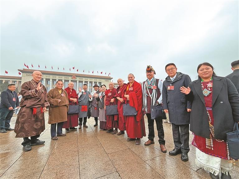 出席全国政协十四届四次会议的部分住藏全国政协委员在人民大会堂前合影。记者 旦增旺姆 陶玥 琅青措 摄
