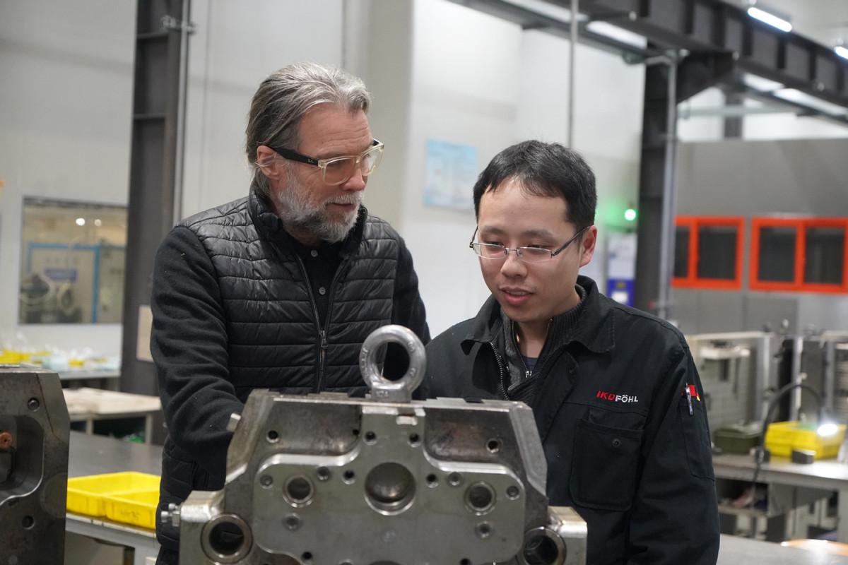 2026年2月24日,爱柯迪富乐精密科技(江苏)股份有限公司董事长齐汉(左)在和员工交流。(图片来源:新华社)