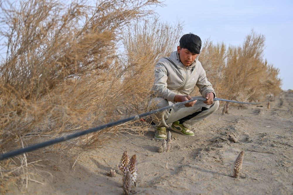 在位于新疆阿克苏地区沙雅县的新疆仙草蓉科技有限公司防沙治沙荒漠植物示范园,工作人员在检查滴灌带(4月13日摄)。  新华社记者 丁磊 摄