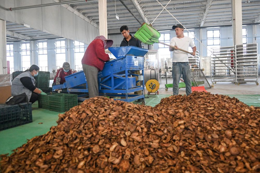在新疆阿克苏鑫奕泽农业科技有限公司,工人在分拣肉苁蓉切片(4月14日摄)。  新华社记者 丁磊 摄