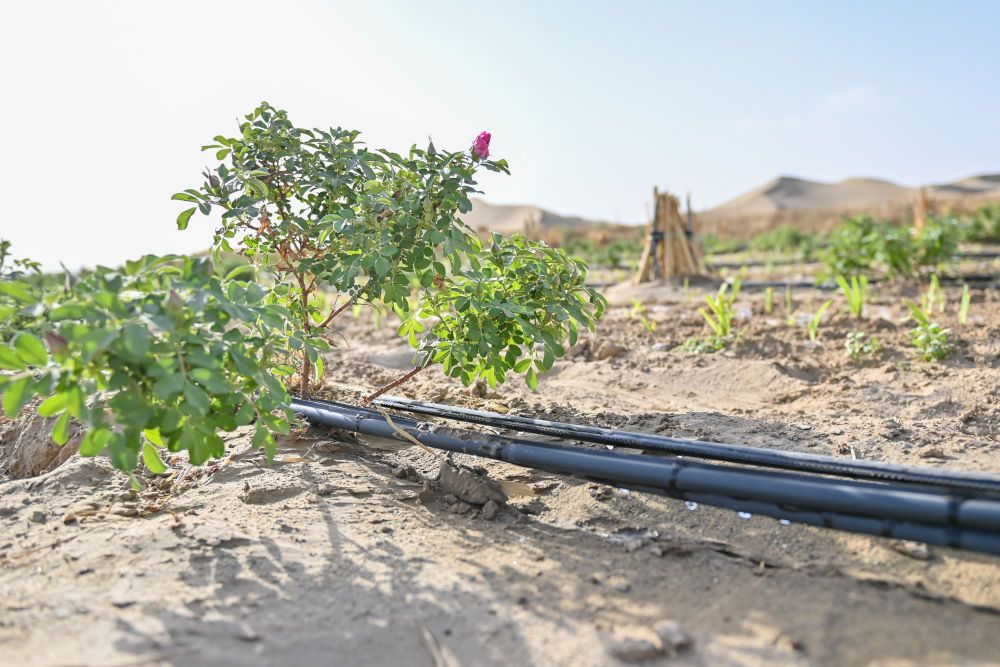 这是在新疆和田地区于田县万花园防沙治沙示范区拍摄的玫瑰花苗(4月15日摄)。  新华社记者 丁磊 摄