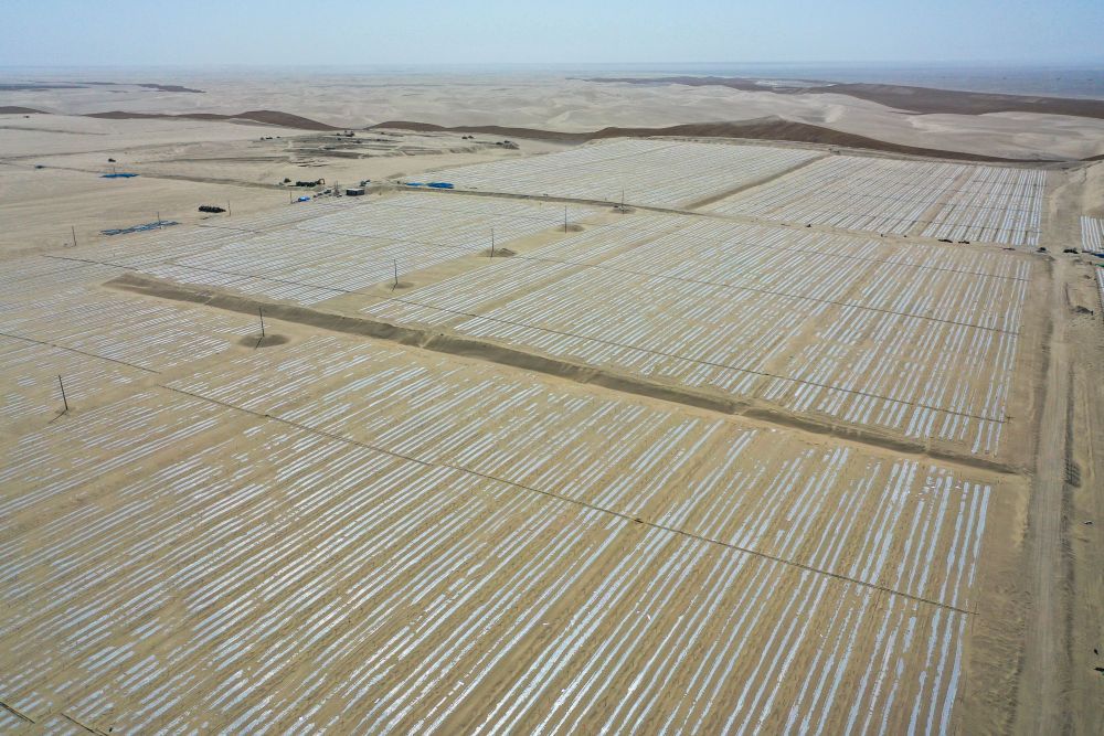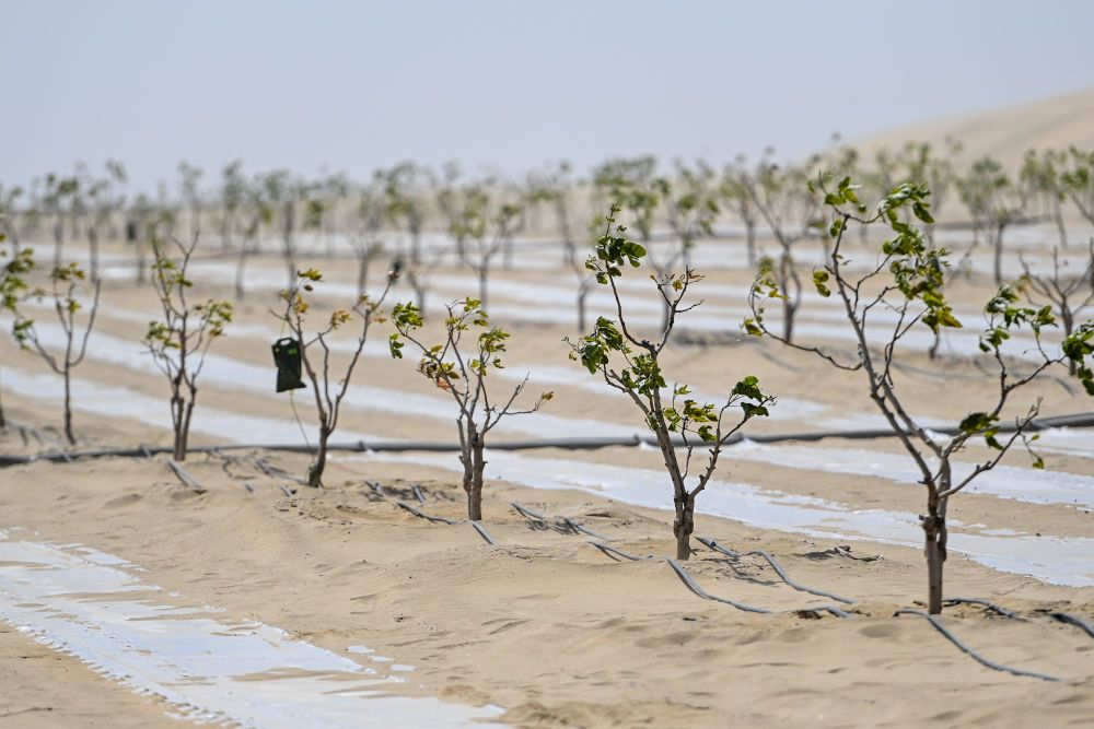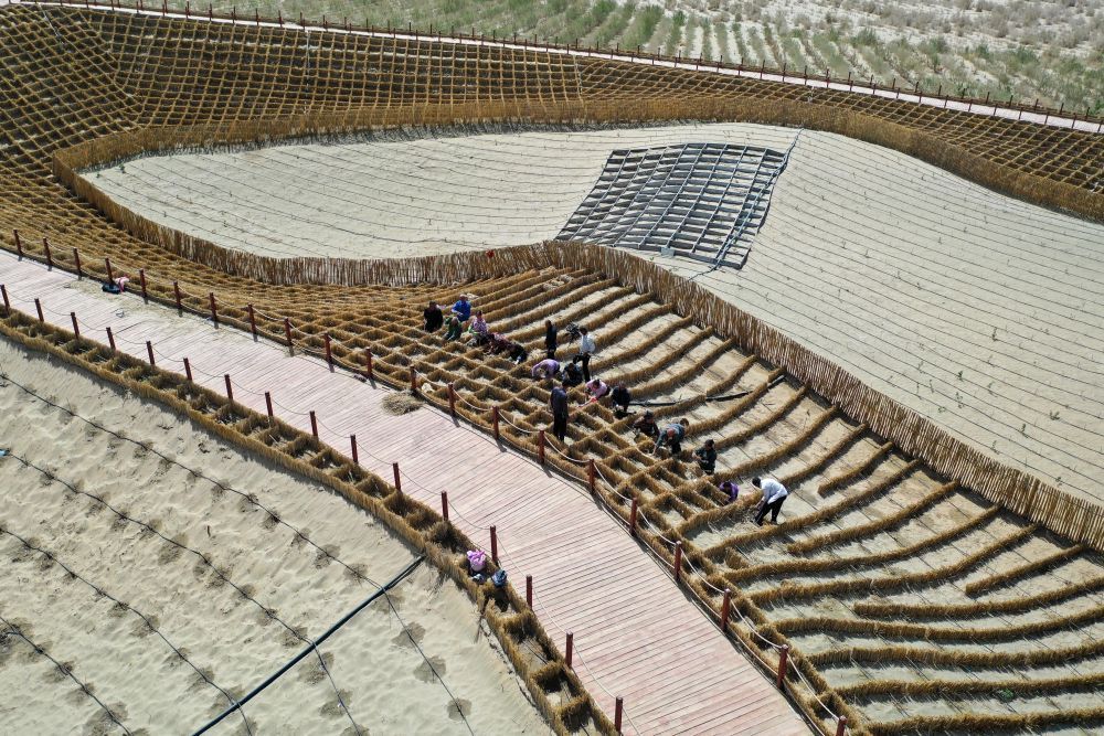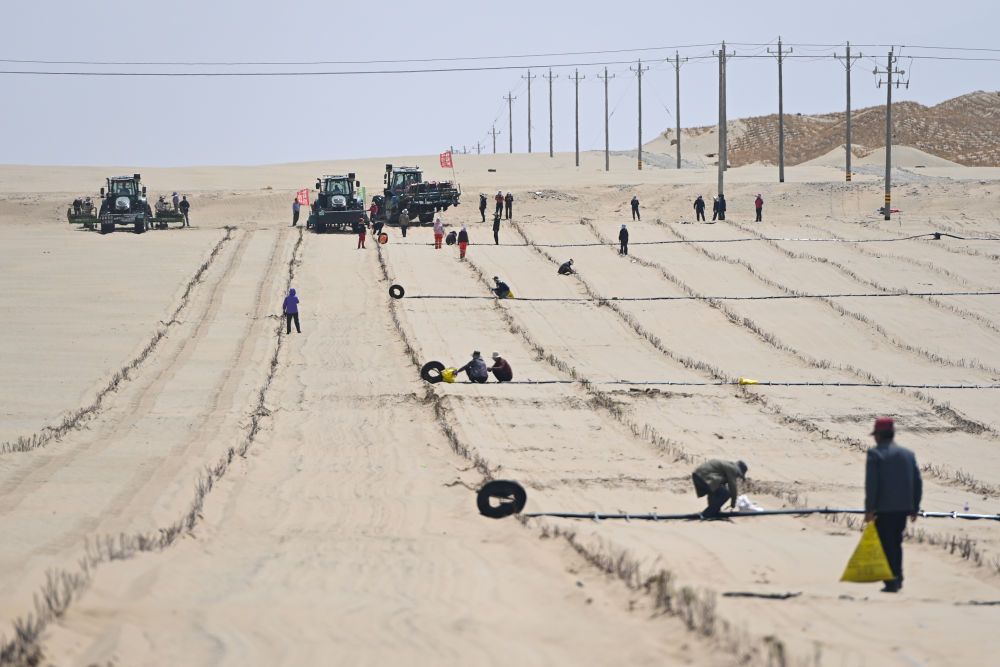 眼下,新疆塔克拉玛干沙漠南缘一派繁忙景象。人们平整沙丘、铺设草方格、嫁接苗木、栽种中药材……塔克拉玛干沙漠边缘治沙正酣。