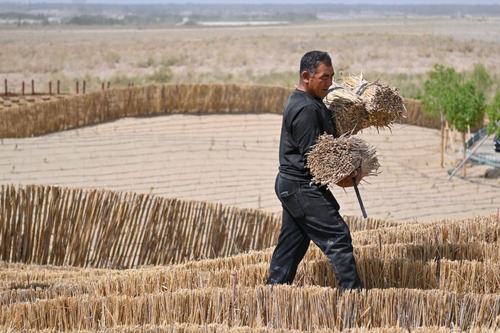 在新疆和田地区于田县阗东防沙治沙示范区,村民搬运制作草方格的芦苇(4月15日摄)。  新华社记者 丁磊 摄