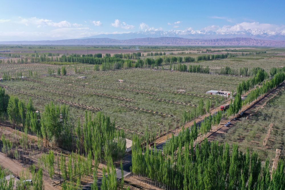 这是新疆阿克苏市丰庆园农民专业合作社示范园的苹果林(4月14日摄,无人机照片)。 新华社记者 丁磊 摄