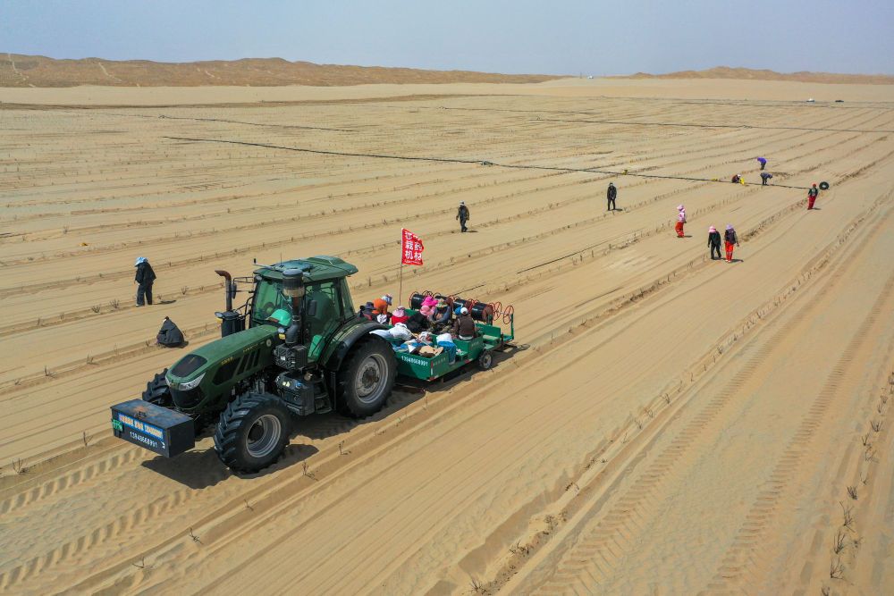 在新疆和田地区于田县阗东防沙治沙示范区,当地村民驾驶机械移栽玫瑰和黄芩,并铺设滴灌带(4月15日摄,无人机照片)。  新华社记者 丁磊 摄