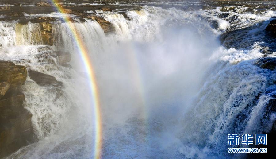 4月23日,黄河壶口瀑布出现双彩虹(无人机照片)。随着汛期到来,黄河壶口瀑布水量增大。飞流直下的瀑布激起大片水雾,阳光直射水雾,出现“彩虹飞渡”的奇观。 新华社记者 陶明 摄