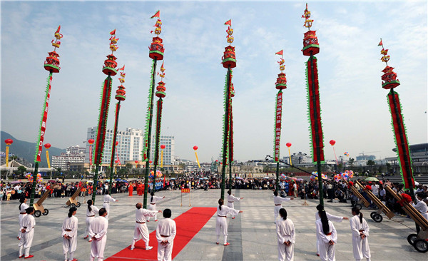 建瓯挑幡 魏永青摄 建瓯挑幡始于明末,建宁府(今建瓯)大洲造船的工匠应征入伍民族英雄郑成功收复台湾的队伍。在收复台湾后的农历正月二十四,百姓为迎接凯旋的将士,设宴席唱戏,将士们则将带回的军旗捆在长竹竿头,尽情挥舞,对壮烈捐躯的弟兄们寄以深深的怀念。以后每年均以此礼节告慰英烈,逐渐演化成当今建瓯民间特有的挑幡习俗,世代相传。 建瓯挑幡制作工艺上有独特的风格。就形制而言,建瓯挑幡的幡要求选用约十米长的笔直毛竹,削去枝叶,上朱红油漆,画上各种吉祥图案。竿顶扎着彩灯,彩灯之下是一座用竹骨和彩绸制成的六角宝塔,四周缀挂着数只小铜铃,塔底顺杆悬挂锦幡一幅,幡幅上绣有褒颂词句。据鉴定,最长的幡为10.2米,幡重为20.6公斤。 今天的建瓯挑幡在保留传统技法的基础上不断发扬光大,形成了一套异彩纷呈、新颖高难的新套路,如“手舞东风转,肩扛南天松,肘擎中军令,牙咬北海塔,口挑百战旗,鼻托乾坤棒,脚踢西方柱”等。 具有文化娱乐与强身健体双重功能的建瓯挑幡名扬海内外,中国上海大世界吉尼斯总部将其列入“吉尼斯大全”。2005年,建瓯挑幡入选福建省第一批非物质文化遗产代表作名录;2008年,入选第一批国家级非物质文化遗产扩展项目名录。 |