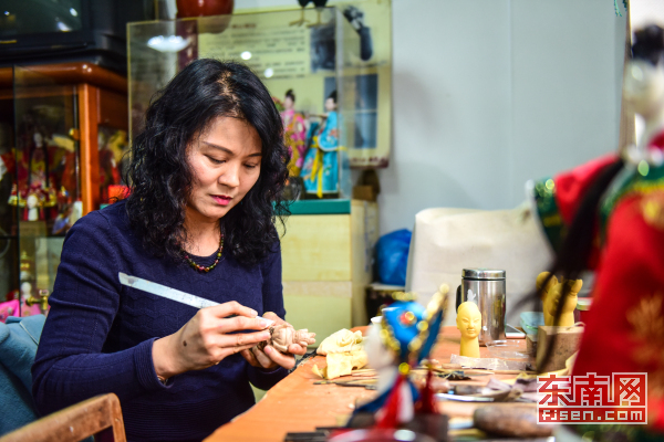 姐姐黄紫燕正在雕刻木偶头。东南网记者 林婕 摄 精细的雕工、鲜明的粉彩、丰富的形象、个性的妆容,正是背后一道道用心钻研的的独门工序,成就了江加走木偶头的细腻生动、灵活灵现,使之成为名扬闽台的传统艺术珍宝。 “在继承优秀传统的基础上创新,真的很难” 黄家的客户70%来自台湾,另外还有来自东南亚、北京、上海、厦门等地的收藏爱好者也会不定期购买。木偶头雕刻的初始用途是用于木偶戏的表演。随着时代更迭,木偶戏不再如从前受欢迎,从事木偶头雕刻的手艺人也愈发变得少了。 “现在用于表演的木偶头大多都不是手工的,手工木偶头价值比较高,又很容易磕磕碰碰,老艺术家都舍不得拿出来表演了。”黄雪玲说,现在购买木偶头的客户,绝大多数都是为了兴趣而收藏。“一个普通的木偶头价值不菲,一些需要复杂工艺的,就更贵了,而我父亲和江加走大师的遗作,价值则更高。” 据介绍,江加走11岁开始随父学艺,把父亲传授的50多种木偶头像,继承发展创作出了285种不同性格的木偶头像,其中250种都有称谓,雕刻和粉彩的木偶头像过万余件之多,深受闽台民间欢迎。