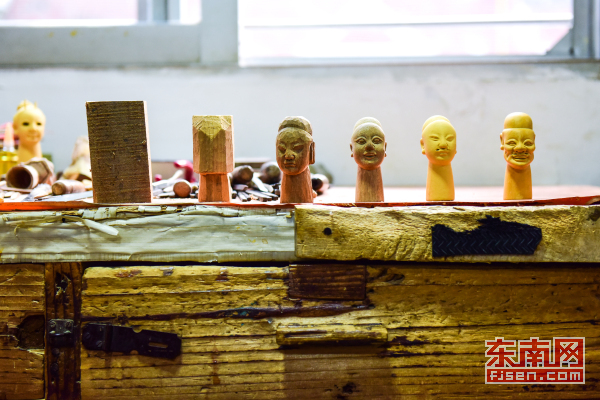 一个木偶头,从一块木头到成型,需要二十几道大大小小的工序。东南网记者 林婕 摄 “我们姐妹俩都是20岁以后才开始学艺的,算是比较晚的。”黄紫燕告诉记者,虽然姐妹俩从小受父母影响,对木偶头雕刻耳濡目染,但都是在相继完成了美术设计相关专业学习后才开始正式学习雕刻。“很多小孩子看到木偶头会害怕,但是我不会,反而觉得很有趣,但是开始正式学习后就不是那么一回事了。”黄紫燕说,一个雕刻木偶头的手艺人,没有十几年的功底,是很难有优秀作品出炉的。 一个木偶头从坯形、粗雕、上土、细雕、粉彩到梳发髻,大大小小需要二十几道工序。“初学之时,一个耳朵、一个眼珠子都要经过很长时间的反复雕刻、琢磨。”黄紫燕说,制作一个普通的木偶头大概需要一周的时间,要做成动态的,让木偶的眼睛或嘴巴能动,则需要十天半个月。