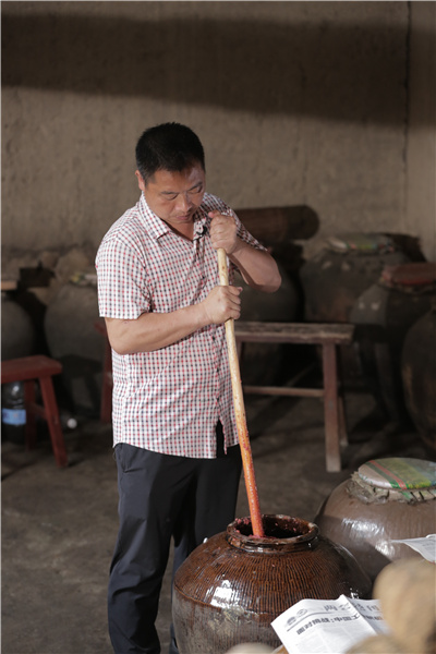 酿酒过程中的发酵管理。林浩宁 摄 由于糯米黏性极强,入酒坛之后,需尽快搅拌,使曲水与糯米充分接触。“这是最辛苦的一个环节,也是一个享受孤独,享受和酒独处的环节,”吴善寨介绍道,搅拌要持续上3个月,又以头半个月最为辛苦,需早、中、晚三次开坛搅拌,每次搅拌时间约90分钟,是一个相当消耗酿酒师体力和心力的过程。之后随着发酵的深入,搅拌次数减少,时间与强度也逐渐降低。 而在所有工序之中,最考验功夫的环节非煴酒莫属了。所谓煴酒,即“煮酒”,通过焚烧稻杆、谷壳,以此增加酒的香气。“煮”的过程中,最为人称道的,就是对于火候的掌握,火大了容易过,烧出来的酒味道、颜色都会受到影响,小了又达不到煴酒的效果。个中精妙,只有拥有十几二十年经验的酿酒老师傅方能掌握。 千年古技盼传承 现年49岁的吴善寨,出生在屏南县北墘村一个酿酒世家,爷爷是一名小有名气的酿酒师傅。“我大约是10岁开始接触酿酒。经常在酿酒的时节,半夜偷偷起来到村内的井边,看大人打水。当时作为小孩,最开心的就是酿酒时节了。因为能吃到许多酿酒剩下来的糯米。”回忆起儿时与黄酒结缘的趣事,吴善寨的眼里依旧闪烁着欣喜的光芒。