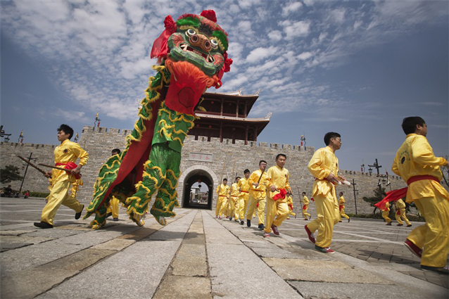 “刣狮”表演场面热烈威武。颜华杰 摄 传统狮阵排练操演时,彩旗飘飞,锣鼓震天,各种阵法穿绕首尾呼应,阵势变幻莫测。卢厝狮阵至今仍保存着古朴的“阵法武术”训练形式。操演开始,锣鼓钹声催响,随着节奏音调变换,磅礴阵势呼之欲出。龙虎旗、狮旗是狮阵的指挥旗,以此为前导,狮阵武师分两列阵队,每人各执一种兵器,拥簇青狮出阵入场。随后,两行队列进行环形穿绕,青狮穿插队列行间,奔腾跳跃,表演各种舞狮技巧。狮阵阵法随着鼓声快慢强弱而变换,时而急促,时而缓慢,表演者穿绕跌圈,首尾相接,转换兵器,行云流水,阵法不停变换,各种拳术、器械、对练展示出南少林武术风采,更体现了闽南人民保家卫国的尚武精神。