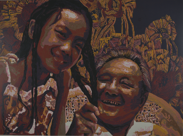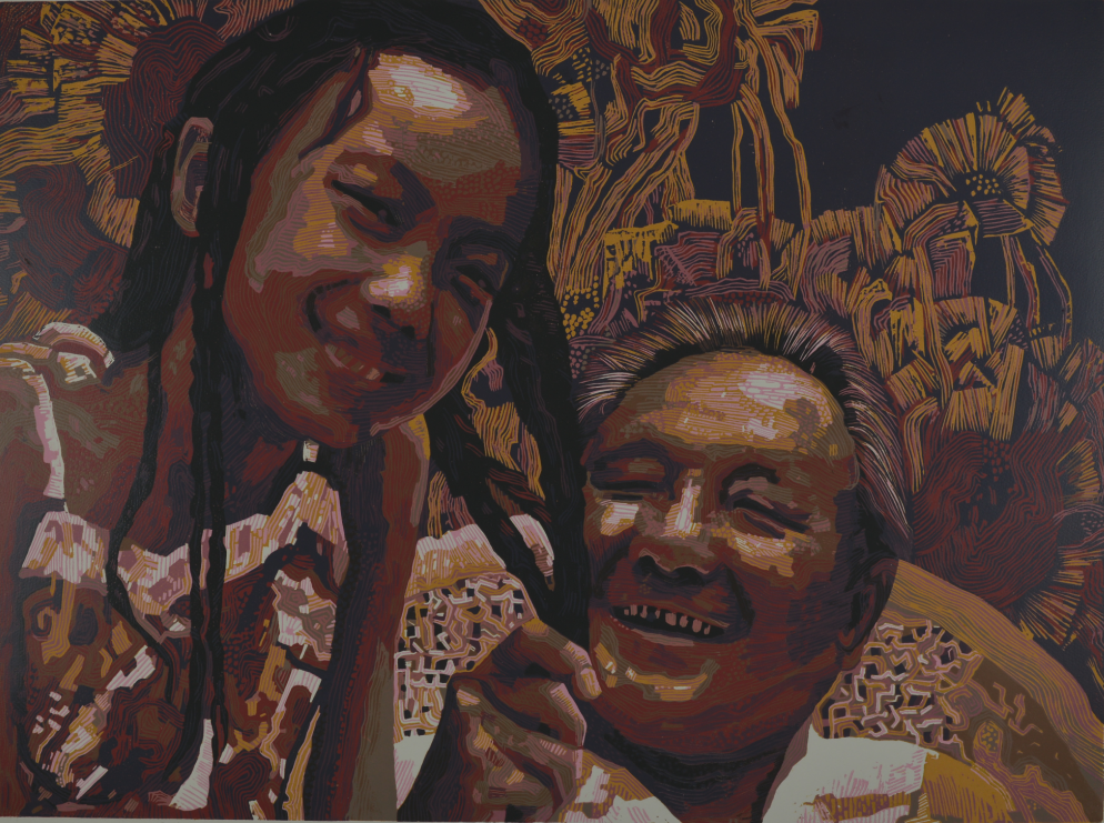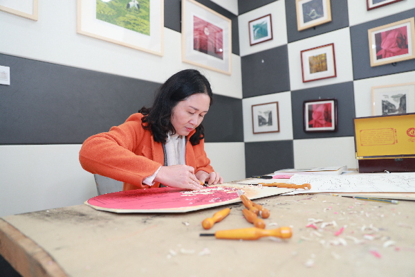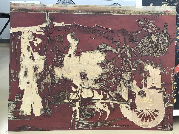 蔡丽正在板上进行创作 受访者供图 打破黑白格局 走入各类展览 早期的松溪版画以黑白木刻版画为主,黑白木刻版画极讲究刀法和黑白灰的布局,要做到极致特别难,而单一的黑白语言也在很大程度上限制了艺术家的创作表达。2001年,绝版套色木刻的引入拓宽了松溪版画的技法和创作语言,让画家能够更好的表达内心的创作意图,也更好的保护了松溪版画的艺术性。因为,绝版套色版画是边刻边印,一次次一层层套上去,当一幅版画印好,它的母版也随之报废。由于创作的版画不可复制,存世数量有限,它的艺术价值也因此提高。“你看这幅画左下角的十分之三,就是这幅画的原作只有十张,这是其中的第三张。”蔡丽指着一幅画为我们解说道。 艺术创作的单一手法被打破,版画的表现能力越来越丰富。刚开始接触绝版套色版画的时候蔡丽很兴奋,她相信这会是松溪版画新的发展机会。但是真正在创作过程中,却面临着很大的难题。“来授课的厦大魏启聪教授把绝版套色木刻技法给我们演示讲解一遍,待了一个星期回厦门了,剩下的所有东西都靠我们自己慢慢摸索。”蔡丽告诉我们。
