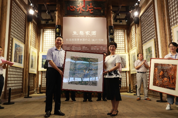 6月12日,松溪版画晋京展作品(福州)巡展在福州海峡民间艺术馆举办,蔡丽的作品也参与展出。记者一行在福建省海峡民间艺术馆内见到蔡丽时,她正在环顾四周,调整作品位置,为第二日的巡展做最后的准备。身为松溪县版画院院长、中国美术家协会会员,松溪版画省级非遗代表性传承人,蔡丽重视每一次版画展出。她说“每一次展出,都能够让版画更多地出现在大众的视线里,也更好地激发版画艺术的生命力。” 6月12日松溪版画(晋京)作品巡展在福州海峡民间艺术馆展出 受访者供图 文脉可溯千年 “黑白双刀”潜心艺术 松溪县是全国唯一的“五连冠”版画之乡,松溪版画是一门既古老又年轻的艺术,文脉可追溯至千年前的建安版画,即建本所附的图本。1994年,松溪县成立女子版画班,在县里种下版画艺术的种子。 “我就是第一期女子版画班学员,当时全县仅20多人。”蔡丽说。版画的独特创作方式和艺术魅力使她们热情地投入到版画的创作中,其作品在松溪崭露头角,吸引了一些爱好者投身其中,但是版画在当时仍然不是主流的艺术。“一段时间后,一些作者因为家庭的原因离开了创作团队,还有一部分因为创作热情的缺失放弃了。”蔡丽告诉我们,创作人员的流失,让松溪版画的发展一度变得停滞不前。 当时,蔡丽的工作室与住所相隔一个操场,为了版画艺术的继续发展,蔡丽每天的行程就是家和工作室两点一线,大量的时间花费在创作和刻印上。“与复制版画不同,现代创作版画在画稿、雕刻和印制上都由画家一人完成,是画家独立的创作,过程比较漫长。”蔡丽说。丈夫兰坤发也是松溪版画省级非遗技艺传承人,夫妻两人是松溪版画界有名的“黑白双刀”,双双将精力用于版画的创作和发展上,便无法常陪伴孩子。“我只得隔着操场‘遥控’孩子。”蔡丽说。 家庭无法兼顾,创作再遇瓶颈,这是让许多版画创作者放弃的一道坎。蔡丽也曾一度想放弃,但是仔细想想,只有版画最能表达她内心的想法。最终,她坚持着拿起刻刀,将自己对家乡的热爱和人生的思辨刻印板上。在创作上的付出,给蔡丽带来的是丰硕的果实,《乡村系列》、《都市系列》等版画作品相继入选全国的专业美展并且获奖、被收藏。