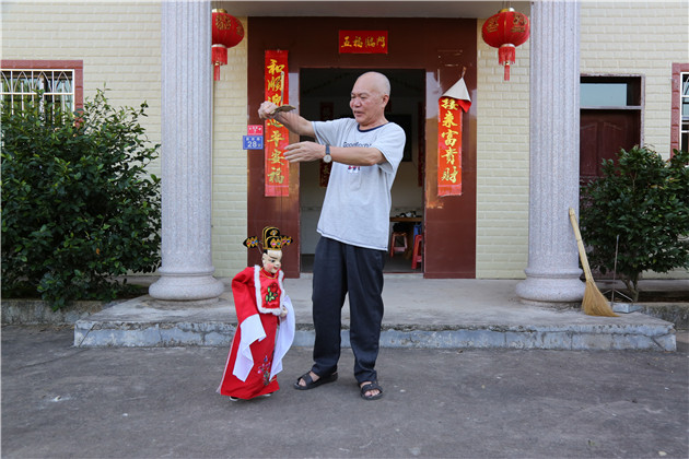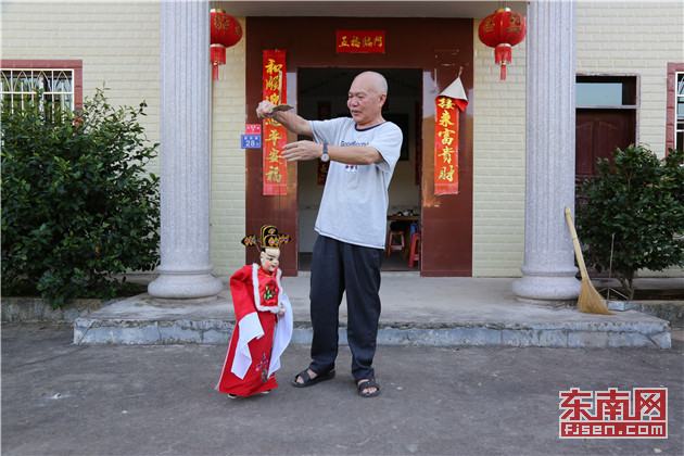 王荣昌在家门口表演木偶提线技艺。王炜元 摄 闽西傀儡戏继承了弋阳腔的声腔系统,其中,舞台语言用的是客家方言,道白用的是俚语俗话。主要分为“高腔”与“乱弹”两大戏种,与“乱弹”相比,“高腔”对木偶艺人本身的唱功要求更高。 据上杭县文化馆副馆长李伯庠介绍,王荣昌不仅娴熟掌握提线技巧与舞台锣鼓,而且谦虚好学,能从方言、小调、杂曲、习俗中汲取营养丰富自己的唱腔,而说唱又十分通俗有趣,因此深得客家民众的喜爱。他的演出地点以上杭为主,有时也会到广东、江西,以及省内福州、厦门、莆田等地,“最多的年份,剧团一年演了6个月又17天。” “表演时全情投入,声音语调有很强的艺术感染力。”在李伯庠看来,王荣昌对角色性格把握精准细致,源于他丰富的人生阅历。 事实上,年轻时王荣昌曾在沈阳服役五年,复员返乡后还做过民兵连长、民办教师。1988年至1996年,王荣昌连任三届彩霞村村主任,后来还担任彩霞村支部书记。而这期间,他一边带领村民调整产业结构、实现脱贫致富,一边还和徒弟们带团演出,并成为彩霞村当年有名的万元户。 在许多人看来,王荣昌名利双收,人生已经颇为圆满。然而1999年,王荣昌却突然辞去支部书记一职。他对外宣称,退位让贤是为了给年轻人更多成长机会,但了解他的人明白,放弃仕途的王荣昌有着另一番打算。