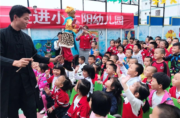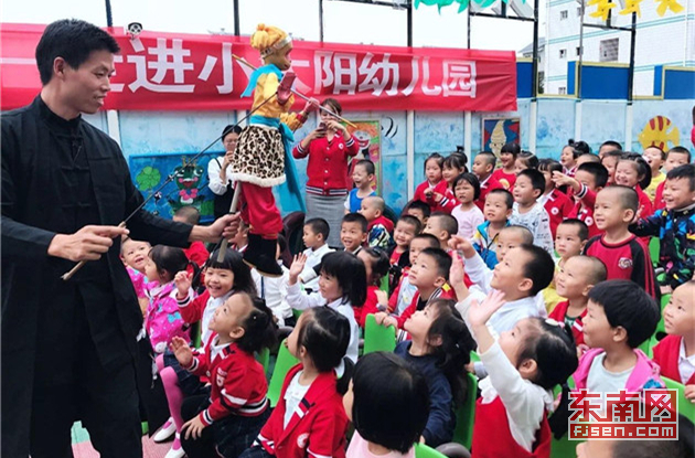 “木偶进校园”活动场面。上杭县客家木偶艺术传习中心供图 进入新时代,随着国家对传承优秀传统文化的重视,作为闽西客家艺术瑰宝的傀儡戏也得到当地政府的大力扶持。 2015年,根据相关文件精神,上杭县艺术中心更名为上杭县客家木偶艺术传习中心,闽西上杭傀儡戏的传承多了一份助力。 “政府每年给予中心20万传承经费。”上杭县客家木偶传习中心主任邱保铭告诉记者,传习中心每年至少举行50场木偶戏展演,通过“木偶进社区”、“木偶进校园”等措施,让闽西上杭傀儡戏重新回到大众视野。“我们现在返聘了多位木偶老艺人为传习中心开展不定期的授课。”邱保铭说,另一方面,为了提高木偶表演艺人的水平,除了积极组队参加各地木偶交流活动,上杭还派专人前往泉州、厦门等地学习技艺,并邀请外地专家来上杭指导授课。此外,传习中心通过培养、招收学员等方式不断为木偶戏演出队伍储备人才,“现在我们的队伍不断壮大,其中有15个是年轻人才”。 “从小我就很喜欢看傀儡戏。”2016年,刚刚大学毕业的叶曼云怀着满腔热血报考了上杭县木偶艺术传习中心,几乎与此同时,她在朋友的引荐下认识了王荣昌,并很快拜在他的门下。 在她眼里,师父不仅技艺高超,而且和蔼可亲,“第一次到师父家里拜访,他就留我们在家吃饭,非常热情。”从此,叶曼云常常驱车来到泮境,跟着王荣昌学习木偶表演、提线、唱腔等技艺。如今,她已经成为上杭县客家木偶传习中心的骨干成员。