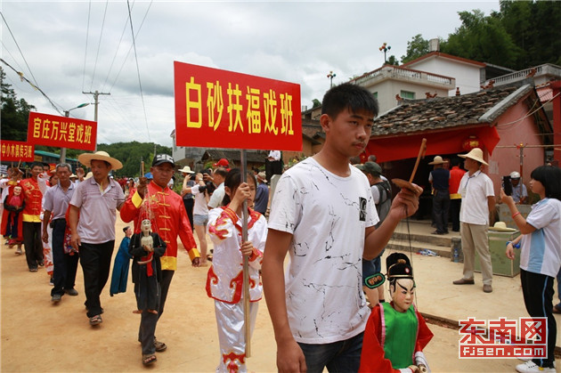 “田公元帅信俗”中的木偶展演场面。上杭县客家木偶艺术传习中心供图 “由于种种原因,傀儡戏班人才凋零,演出日益减少。”2000年3月,为了重振闽西上杭傀儡戏事业,协调各地傀儡戏班并解决相关问题,王荣昌协同梁礼忠、刘金寿等人筹划“田公堂”修复开放暨傀儡戏祖师“田公”偶像揭幕仪式。2001年,闽西木偶戏行会(田公会)在中断近四十年后,于白砂水竹洋再次举行。通过订立、完善“田公会”章程,白砂镇水竹洋村的“田公堂”成为傀儡戏行业祭祀和傀儡戏艺人、班主献艺、汇演、交流的中心。 2002年,上杭县成立客家木偶文化艺术研究会,并全面恢复“田公会”的祭祀和傀儡戏班社的调演,古老的傀儡戏剧行会传统得以保存。2011年,上杭“田公元帅信俗”入选第四批省级非物质文化遗产名录。 李伯庠说,“田公元帅信俗”的恢复大大提高了闽西上杭傀儡戏的影响力和知名度,对傀儡戏的传承和发扬有着重大而深远的影响,“王荣昌在其中担任历届主祭,其地位和特殊贡献可见一斑。” 传扬 老艺迎来“新声”