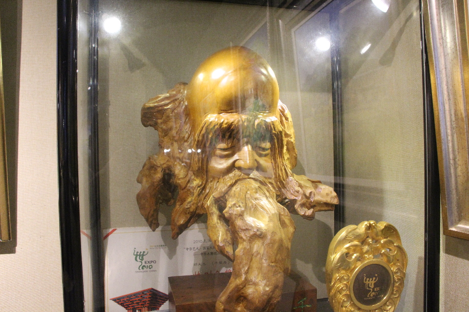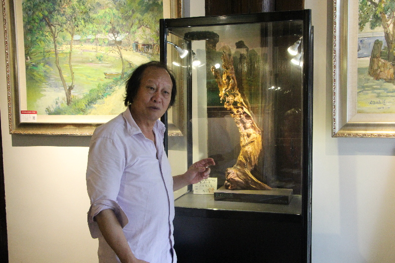 郑大木在介绍自己作品的特色。 东南网记者 卢金福 摄 郑大木的木雕创作风格既传承了福州传统技艺精致细腻的特点,又在后期融合了返璞归真的风格和抽象艺术的理念。他认为,在雕塑艺术作品中的自然形态美为上等,不要太苛求形象美、精确美和比例到位美等。 “大自然是一切创作的源泉,真正好的艺术品归于自然和简洁。”郑大木说自己所有的创作灵感都来源于大自然,对山水树木,花鸟鱼虫等大自然的一切都要细心观察,才能创作出好的作品。 记者看到,郑大木创作的题材十分丰富, 既有栩栩如生的动物花鸟,也有妙相庄严的观音佛陀,还有历代人物的传神造型。郑大木比较喜欢以童趣的题材,《寿星》系列作品受到了不少收藏家的喜爱,《千载寿》还获得了2010上海世博会中华木雕精品展金奖。他创作的寿星面部看起来像个天真的小孩子,笑得灿烂,表情丰满。他说,人的一辈子有两个孩子阶段,一个在襁褓当中,一个是老年时期又回到童年的样子,达到了无我的境界。
