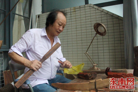 郑大木在做木雕。 东南网记者 卢金福 摄 郑大木告诉记者,福州过去从事木雕的艺人被称做“古董”,福州在甲午战争后被辟为五口通商口岸之一,也催生从事木雕生意的古董商,福州木雕就以古董形式出现在国外市场上。不少福州人还跨过海峡,来到台湾谋生,其中包括不少木雕师傅,在台湾木雕界享有盛名的工艺大师中,福州籍人士占了相当大的比重,如今台湾岛上还遍布各时期来自福州的木雕艺人创作的作品。 “榕台的木雕技艺是一脉相承的,台湾木雕的主要集中地是在三义,民间流传祖师爷就是从福州象园过去的。”郑大木说。1945年台湾光复后,三义木雕的从业人员,还专门派人到福州“寻根”,聘请福州的木雕艺人到三义带徒传艺,提升当地的技艺水平。 上世纪60年代,在福州象园、大坂、雁塔三个村几乎家家户户都做木雕。从小在南公园生活的郑大木告诉记者,当时的木雕是前店后作坊的格局,“小时候走到街上,常能听到叮叮咚咚雕刻的声音。” 郑大木说。象园派木雕早期艺人都姓柯,1936年,当时的福建省相关部门在前屿开设雕刻科班级,聘请象园派名艺人柯经煊出任专职木雕教员。柯经煊的高徒有后来木雕界大师阮宝光、柯依斌、阮文瑞等,郑大木年轻时拜阮宝光为师,学习木雕技艺。 “大自然是一切创作的源泉”