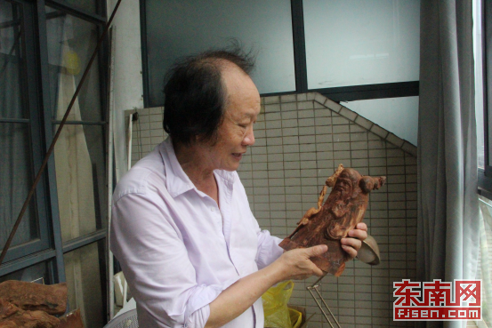 郑大木在介绍木雕创作过程。 东南网记者 卢金福 摄 一走进位于福州金融街万达附近一小区的郑大木工作室,记者就闻到浓浓的木材味道,各种木材堆放在房间的角落里,看起来并不起眼,但对郑大木来说却是大自然留下的财富。 “你闻闻看,这一块是印度老山檀木,现在市场已经很少了。”郑大木和木材打交道四十多年,木材品类如数家珍,他告诉记者,福州木雕以龙眼木和黄杨木为主,后面又融入了海南黄花梨、印度小叶紫檀、印度老山檀、沉香等木材。 在工作室里,只见各种木雕作品琳琅满目,郑大木还拿出了自己珍藏多年的木雕作品,让记者欣赏。郑大木把自己当成一名“修行者”,主要精力放在木雕作品创作上,在他看来,木材是大自然未完的艺术,他用手中的刀、砂石给木材重新注入新生命。 木雕创作是一个非常的繁锁的过程,有数道工序。郑大木说,做木雕要选材、构图、打粗坯和精坯、修光、磨光、打腊、上漆等工序。“一整套流程下来,好的作品要一两年,普遍的作品也要一两个月,构思要花比较长的时间。”