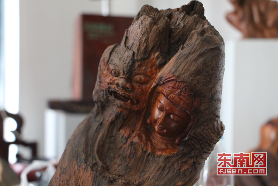 作品《一念之间》 东南网记者 卢金福 摄 郑大木还把自己对人性的思考和对大自然的理解融入到作品中。一颗形如苹果的树瘤,让他想起了伊甸园的故事,雕刻出了卷缩在苹果中的夏娃,其娇羞的神态惟妙惟肖。去年他创作了作品《一念之间》,在一块木头里连着雕了观音和魔鬼头像,“三字经说人之初性本善,但我觉得善恶是综合的,都在一念之间。”郑大木说。 这件作品也受到了不少粉丝的好评,有评论认为,郑老师匠心独运,对一块天然的根木进行艺术化创作,他尊重自然,因势利导,巧妙地只在根木上部进行创作。作品在自然而然中艺术化地表现了人性的两面,并强调了善之美、恶之丑的主题,警示世人不要随波逐流,应格物致知,在修行中绽放绚丽的人生。 郑大木还不停地吸收其他门类艺术作品的特色,业余时间喜欢听音乐、绘画和书法,前几年还喜欢上建盏制作,也收藏不少其他艺术家的作品。在他看来艺术都是触类旁通的,没有很好的音乐基础,对体育运动的爱好,以及对历史的了解,永远不会成为艺术家。 设工作室让木雕传承后续有人 福州木雕的传承问题让郑大木十分忧心。他说,随着城市的变迁,木雕艺人创作的集中地慢慢消亡,同时许多工艺品制作已经用机器代替手工,民间艺人失去了生存的土壤。现在年轻人缺乏长期修学的毅力,随着越来越多老艺术家仙逝,木雕这个行业已经青黄不接了。