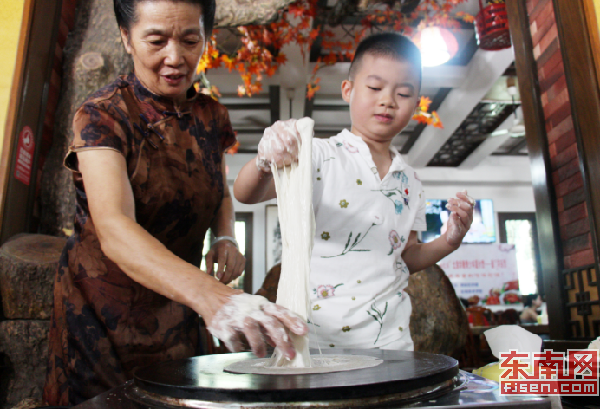 一位小朋友正在尝试薄饼皮的制作,吴招治在一旁教授。 东南网记者 颜财斌 摄 “从那时到现在虽然没赚很多钱,但做了很多‘传承’的事。”现在,吴招治已年逾花甲,但对于传授薄饼制作技艺依旧毫不懈怠。就在7月底,有两位法国游客通过网上资料找到了吴招治的门店。他们向值班店员表达了自己对薄饼制作技艺的兴趣,希望可以拜访到吴招治本人,向她学习“擦皮技艺”。 “当时我刚从医院拔完牙回来,脸都是肿的,身体十分疲惫,但是想到人家漂洋过海专程来学习,就立刻起身,耐心教他手艺。”吴招治说,当时牙龈痛得说不出话,只能用手势配合店员的解说,尽量让他们可以感受到中华传统美食的技艺。 家住同安的陈同学今年9岁,和妈妈一同来店里享受美食的同时,刚好遇到吴招治正在做薄饼皮。就这样,正在一旁专注观看的陈同学被热情邀请体验了一把如何“擦皮”。他开心地告诉记者:“这是第一次做薄饼,感觉很有趣,吃起来比以往的薄饼更香。” 无论人多还是人少,无论来自哪里,吴招治都积极主动将这份手艺亲授给每位游客,并且全程免费。在她看来,这就是非遗传承人的责任。“我有义务,更有责任把手艺教授给更多的人”。 巧打文化牌 薄饼名声越来越响 为了更好地传承薄饼制作技艺,吴招治还热衷传播美食文化,积极参与世界闽南文化节、两岸美食文化座谈会等,这也牵引着薄饼走得更远,名声叫得更响。 非遗传承的不仅是技艺,更是文化。受到身边文化友人的启发,吴招治渐渐明白,以传统风俗为根基的小吃,更要懂得巧打文化牌。此前,在薄饼店开张时,不少画家、书法家前来捧场,有的题字,有的作画。厦门知名画家许文厚还早早画了一幅展现“薄饼”由来的作品,挂在了店内展示。有了名人书画的加持,薄饼店里的文化底蕴愈发深厚。 不久前,吴招治在朋友的帮助下,还制作了一部“文化味”十足的“同安历史名人与民间小吃菜谱”。龙裤菜、闽王菜、苏颂药膳、文公菜……这个由她的好友挖掘的同安历史名人与民间小吃菜谱,每天都会吸引了不少食客的眼光,也让薄饼店的“文化味”越来越浓。