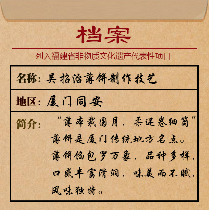 以传统风俗为根基的小吃,更要懂得巧打文化牌。吴招治热衷于传播美食文化,积极参与世界闽南文化节、两岸美食文化座谈会等,这让薄饼走得更远,名声叫得更响。吴招治还在朋友的帮助下,制作了一部“文化味”十足的“同安历史名人与民间小吃菜谱”,每天都会吸引了不少食客的眼光,也让薄饼店的“文化味”越来越浓。