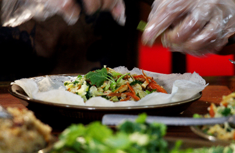 同安薄饼的原料搭配。 东南网记者 颜财斌 摄 相传早期,同安家家户户只在每年农历二月初二、三月初三、冬至、过年等重要民俗日子才能吃到薄饼。如今,随着人们生活水平的提高,薄饼已成为日常所需。尽管时代在变,但是为了坚守传统的薄饼味道,吴招治一直采用老配方,守护着这份独特的“家乡味”。 “每道菜,每一种配料,我们都精心准备。不同于讲求效率、追求速度的现代化烹饪手法,我们一直坚持传统的烹饪方式,用柴烧米,用大缸揉面。可能会有人觉得这样既浪费时间,又浪费人力物力,但我对薄饼藏有深厚的感情。”吴招治表示,这份温情一定要通过用心的方式传递给他人,让人感受到浓浓的“家的味道”。