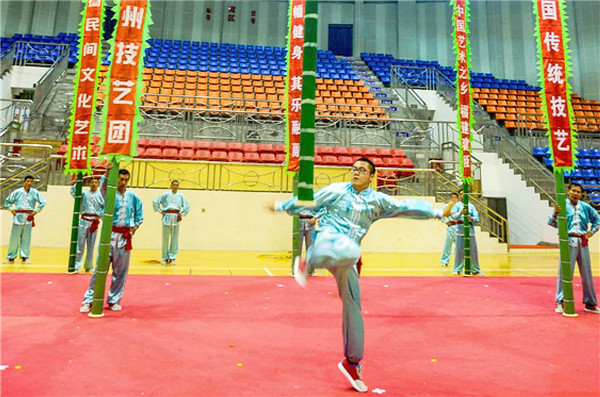 陈泉成早年表演挑幡。 魏永青 摄 然而说起建瓯挑幡的传承,就不得不提到被称为“建瓯挑幡第一人”的陈泉成老人。今年93岁的陈泉成,在建瓯几代挑幡人中,是家喻户晓的人物,当地人都尊称他为“大老陈”。 陈泉成年轻时便广学杂艺,登台表演。1953年时他参加在上海举行的华东首届运动会开幕式,表演挑幡,荣获优秀表演奖。1986年,在陈泉成的积极动员下,7名退休工人联合成立了“老来乐”传艺队。1995年,传艺队更名为“老来乐传艺协会”,自传艺协会成立以来,陈老便一心扑在传艺上,毫无保留地将自己平生所学传授给他人。团队成员从最初的7人发展到470人,年龄最大的83岁,最小的仅6岁。陈泉成带着他们义务为人民表演、服务。彼时,建瓯挑幡声名远扬,多次到海内外表演,中央电视台到建瓯专场拍摄挑幡表演,挑幡也成为建瓯民俗文化的一张响当当的金名片。 但是,长期以来存在的缺乏活动经费、没有固定训练场所和表演人才青黄不接等诸多问题极大地影响着建瓯挑幡的传承、发扬。 陈泉成教授的弟子便挑起建瓯挑幡的传承大梁。据了解,近年参加建瓯几届“幡王”争霸赛团体赛的队伍也都是从他一手创办的“老来乐传艺队”发展出去的。陈老说:“看到这些晚辈练习挑幡非常高兴,希望他们能把我们这个幡传下去。” 方振南:承上启下的“中生代”