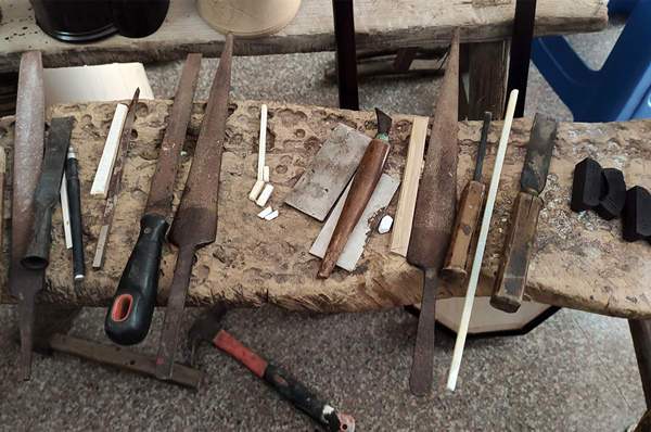 制作乐器的工具。东南网记者 杨超斌 摄 传统手艺的传承大多子承父业。如今,如何更好的发展莆仙传统乐器制作技艺的重任落在了陈金福的儿子陈篙松肩上。 科班出身的陈篙松在大学毕业后选择了回到父亲的小店,背负起第七代传承人的责任与使命,传承和坚守这项“事业”,并希望利用自己学到的新知识、新理念让莆仙传统器乐焕发出新的光彩。 问及学成归来,为何选择这充满着未知变数事业的缘由时,陈篙松显得不以为意。“也许是习惯吧,从小就是在父亲制作乐器的敲敲打打声中长大,自己也在不断学习制作。制作传统乐器已经很自然地成为我生命中的一部分。这些传统的东西挺宝贵的,感觉这么丢了就太可惜了”。 陈篙松告诉本网记者,莆仙传统乐器最初的形式和种类是十分多样的,但是随着整个社会文化的发展,有些乐器越来越不被“需要”了。如莆仙戏中用于丑角出场时使用的笛管以及演出苦情戏时使用的文管,集拉弹于一身的文枕琴,做工精美的碗胡等,这些具有莆仙特色的传统乐器的市场需求也越来越少,面临着被“淘汰”的局面