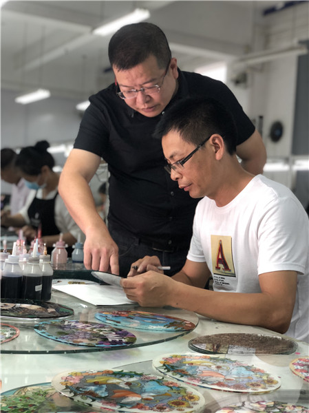 赵献正在指导工人作画。受访者供图 赵献说道,学艺是需要下苦功夫的,例如彩绘玻璃上色,描线等有时需要一坐就是很多个小时,很多年轻人吃不了这些苦。找到合适的工人和画师也费功夫。 推陈出新融入“中国风”