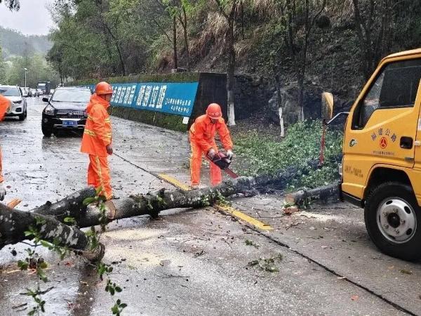三明市公路事业发展中心三元分中心工作人员用油锯快速切割并分解大树。 三元:公路部门全力筑牢清明假期出行安全防线 4月6日18时45分,G205线K2238+850竹州加油站路段一棵50多公分粗的大树倾倒,影响车辆通行。三明市公路事业发展中心三元分中心立即启动应急预案,中村、荆东公路站值班人员迅速赶赴现场。他们使用油锯快速切割分解大树,装载机配合清运树木和泥石。风雨中经过半小时紧张的抢险,隐患消除,公路恢复安全通行。清明假期期间,三元公路分中心加强值班值守,应急保障出动抢险人员36人次,作业车辆12车次,共清理边坡落石5处,处置倒伏路树3处,疏通路侧积水路段2处,并持续对辖区3处水毁隐患点开展布控标志牌巡查维护,为群众清明出行筑起了一道坚实的安全屏障,用坚守与奉献守护着群众平安出行路。