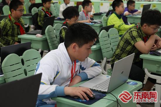 虚拟机器人赛场,选手们端坐在屏幕前,沉浸在代码的世界里。东南网记者 陈诗婷 摄 其中,虚拟机器人赛作为本届赛事热门项目,吸引众多中小学生踊跃参与。选手们在规定时间内完成程序编写、任务调试与成果提交。来自鲤城区实验小学的陈鋆霖,从一年级开始接触编程,五年的学习让他收获满满。这是他第二次参加该项赛事,对自己的赛场表现十分满意。他说,在家人与老师的支持鼓励下,自己通过不断练习、自主调试等方式夯实编程基础,提升实践能力。心怀科技理想的他,未来希望进入高校学习电子工程专业,用专业技能服务社会、报效国家。 丰泽区第二实验小学东海校区的廖俊懿,同样参与虚拟机器人比拼。凭借良好的数学基础,他在四年级上学期开始了编程学习之路。他坦言,编程不仅与数学学习相辅相成,更融入日常生活,为提升科学素养、服务社会发展打下坚实基础。“现在是科技时代,我们的生活与之息息相关,我希望自己将来继续深耕编程,不断向更高层次探索。” 养正中学开发区校区初一年级的罗梓轩,本次征战机器人对抗赛。他从四年级起与编程、机器人结缘,因热爱而坚持,在实践中不断成长。首次参加市级大赛,他既激动又倍感珍惜。备赛期间,他与队友扎实打磨基本功,针对机器人速度快、易失误等问题优化策略、降低车速、强化精准控制,在反复训练中提升竞技水平。在他看来,机器人与编程学习有效培养了时间管理、任务拆解和问题解决能力。他认为,人工智能未来将在高危作业、医疗救援、智能制造等领域发挥重要作用,自己也将以所学所长助力科技强国建设。