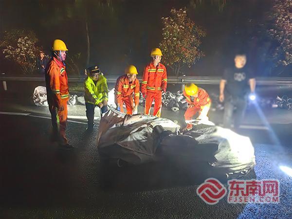 事故处理。宁德高速执法支队供图 经过一小时紧张作业,路面散落物全部清理完毕,主车道顺利恢复通行,现场未发生二次事故。