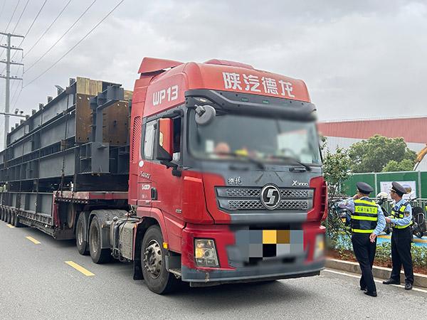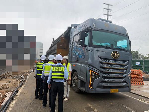 现场图片。宁德高速执法支队供图 接到线索后,宁德高速执法支队一大队迅速部署开展调查处置工作,通过调取收费广场、收费票道监控视频及龙门架车辆通行信息,综合研判车辆行驶轨迹,初步判定涉事车辆运载钢构架行驶方向。大队立即启动联勤联动机制,协调高速交警、地方交通运输执法大队分出多组同步开展联合核查。历经数小时细致排查,最终锁定两辆涉事车辆均停放在某施工项目附近。在相关方配合下,执法人员顺利找到车辆及涉事驾驶员。