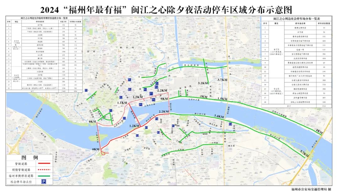 驾车经过活动周边路段的市民,请服从现场交警指挥有序通行,福州交警还为前往活动现场的司机朋友,准备了一份观演停车攻略。 2024“福州年 最有福”新春活动观演停车方案: 为满足广大群众停车观演需求,福州交警对闽江两岸停车资源进行了全面梳理摸排,观演群众车辆可停放青年会绿波停车场、中亭街西片地下停车场、中亭街东片好莱坞地下停车场、台江西路地下停车场、元洪东百停车场、聚春园滨江假日酒店立体车库、老药洲建新停车场、竹排埕旧改项目停车场、福州电视厂台江步行街地块、烟台山街区停车场、共和壹号停车场、世欧上江城地面停车场等18个停车场,预估可提供3561个停车位。 同时,延平路、下杭路、支前路、中平路、南园路、瀛江路、瀛东路、老药洲街、新港街、南光明港路、长乐南路、江九路、江滨中大道主辅道、上藤路、公园东路、大坪路、工农路、工农街、朝阳路、南江滨大道等20条道路,允许群众临时单侧停放,预估可停放车辆2894辆。