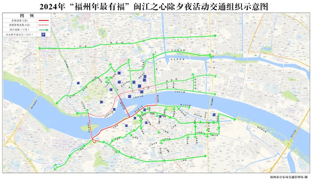2024年闽江之心“福州年 最有福”新春活动,将于2月9日(除夕夜)在青年广场、中洲岛和闽江大桥举行。为确保活动顺利进行,确保活动周边道路交通安全、有序,福州交警将在活动期间,对“闽江之心”周边部分道路,实行临时交通管制。 2024“福州年 最有福”新春活动车辆绕行方案: 解放大桥管制期间,过往车辆建议由闽江大桥、三县洲大桥过江;解放大桥、闽江大桥、三县洲大桥管制期间,过往车辆建议由鳌峰大桥、尤溪洲大桥、鼓山大桥过江; 仓前路、南江滨大道等闽江南侧道路管制期间,过往车辆可通过南二环路、则徐大道、三高路、连江路等道路绕行; 江滨中大道、台江路等闽江北侧道路管制期间,过往车辆可通过六一路、五一路、八一七路、白马路等向北通行后往工业路、国货路等道路绕行。